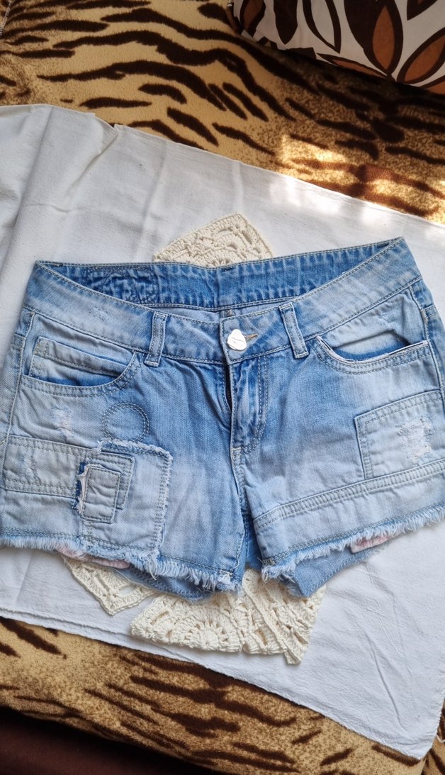 Düğmeli, bol kesim kadın kot şort, pastel mavi bağlama desenli, rahat sokak stili için uygundur.