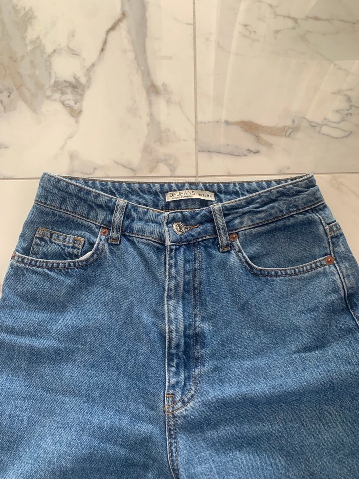 Düğmeli, mavi midi uzunlukta denim kot pantolon, rahat regular fit kesimle. Minimalist, günlük sokak stili için uygundur.