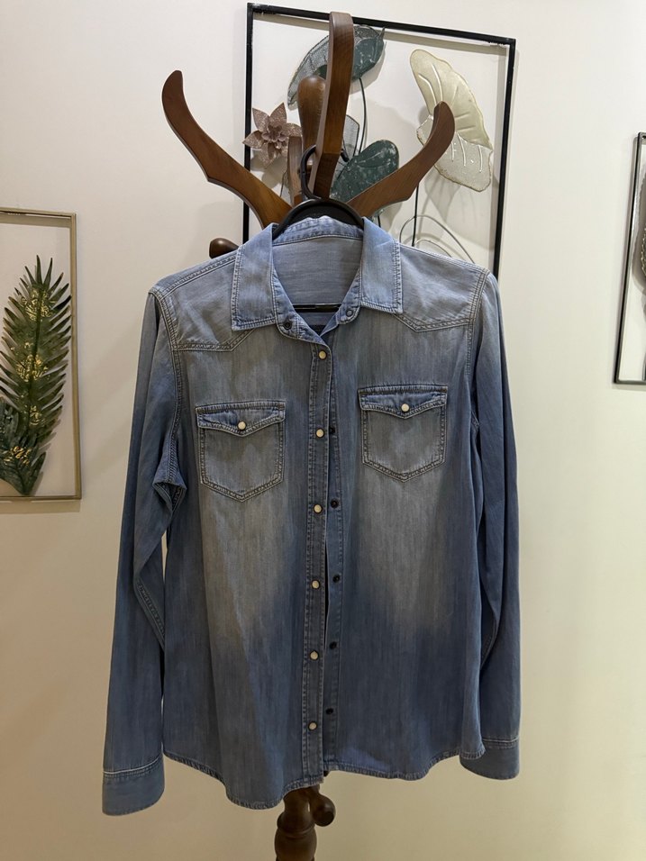 Düğmeli, uzun kollu ve yakalı bu kadın denim gömlek, bol kesim ve mavi batik deseniyle günlük kullanım için rahat bohem stil sunar.