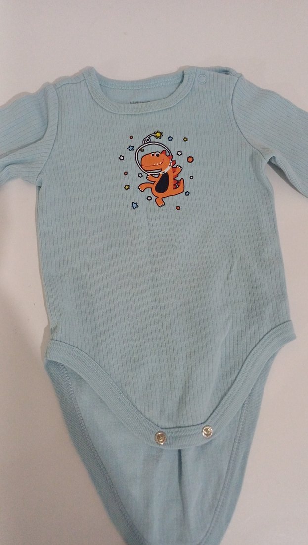 Yumuşak ve sıcak mavi bebek body, uzun kollu ve yuvarlak yakalı. Üzerinde baskılı dinozor deseni ve kolay giyim için düğmeler bulunur.
