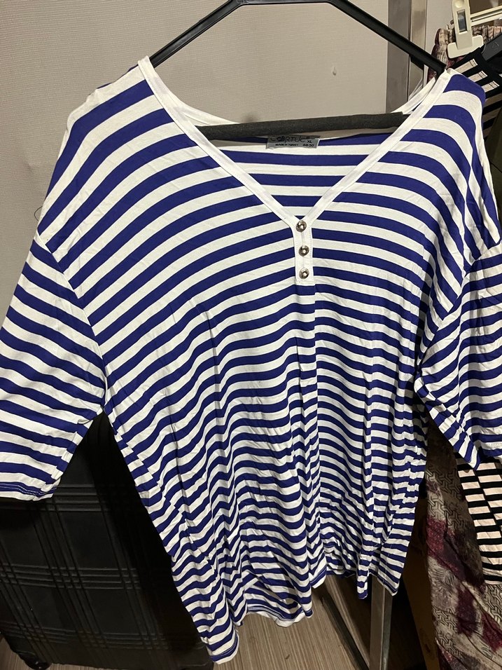 Düğmeli, kısa kollu, mavi beyaz çizgili hamile tişörtü. Pamuklu, rahat kesim ve günlük kullanım için uygun.