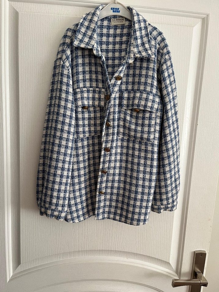 Pamuklu, düğmeli, uzun kollu, notched lapel yaka detaylı, mavi ve gri kareli desenli bol kesim gömlek. Rahat ve günlük kullanıma uygun.