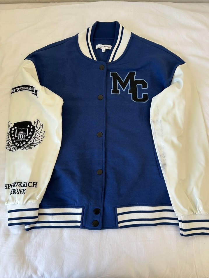 Düğmeli, uzun kollu, bisiklet yaka ve baskılı beyaz kollu mavi, fitted kesim bomber ceket. Spor ve gündelik kullanıma uygun.