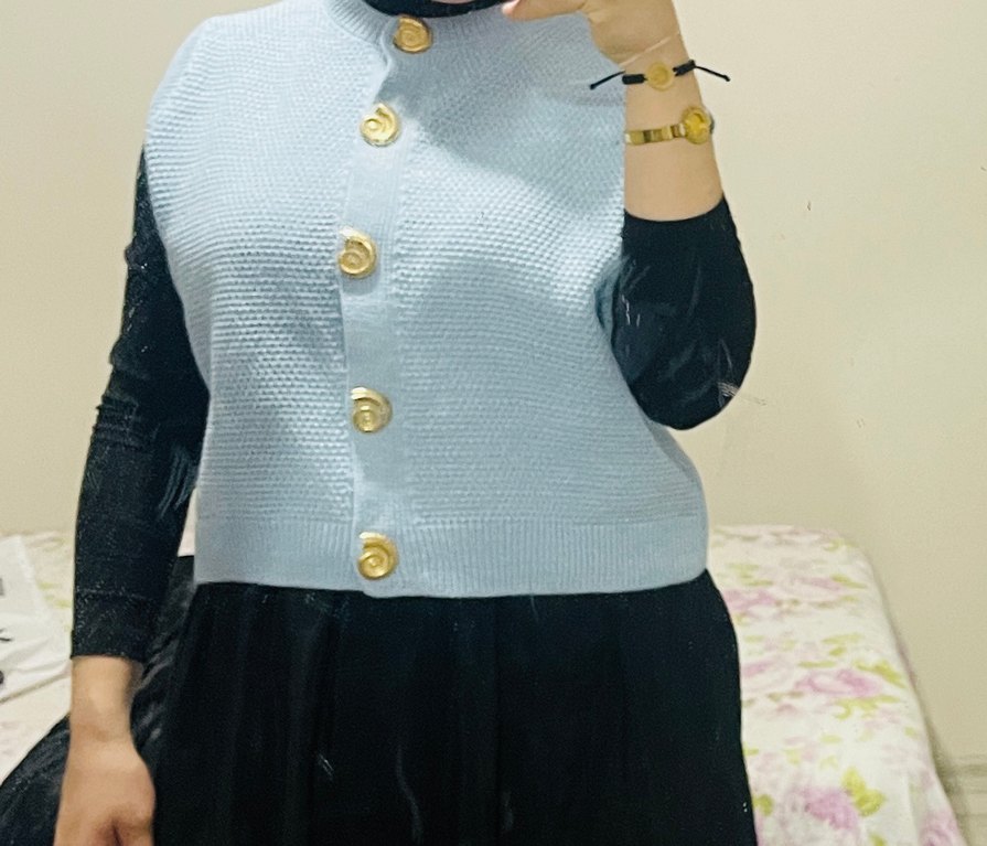 Pastel mavi renkli, boğazlı ve düğmeli ön kısmı ile kolsuz, bol kesim hırka sorunsuz daha yeni aldım görseli net gözüksün diye giydim sadece.Standart beden