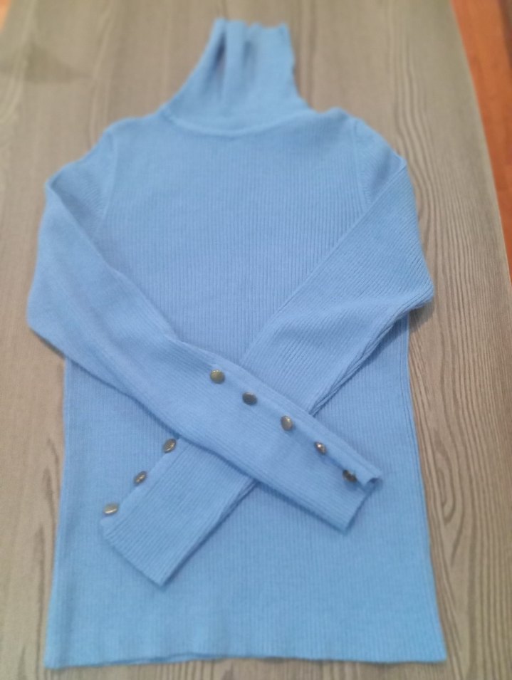 Fitted kesim, pastel mavi renkte, düğmeli uzun kollu boğazlı triko kazak. Normjal boyda, rahat ve normcore tarzda, günlük kullanım için uygundur.