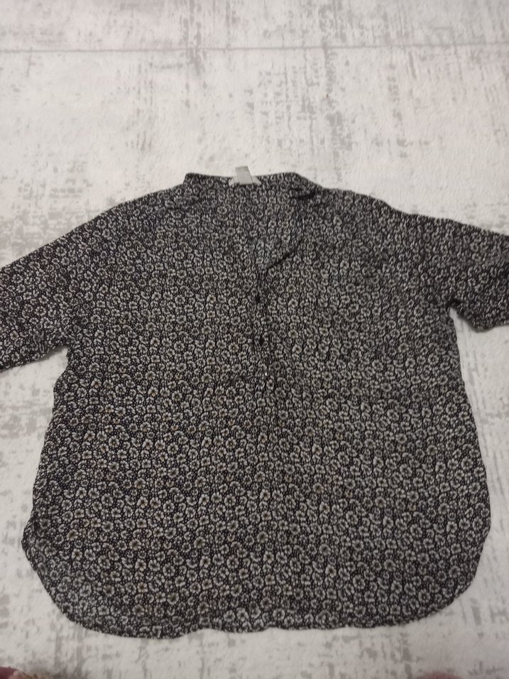 Düğmeli, V yakalı, uzun kollu, mavi baskılı bohem tarzında bol bluz.