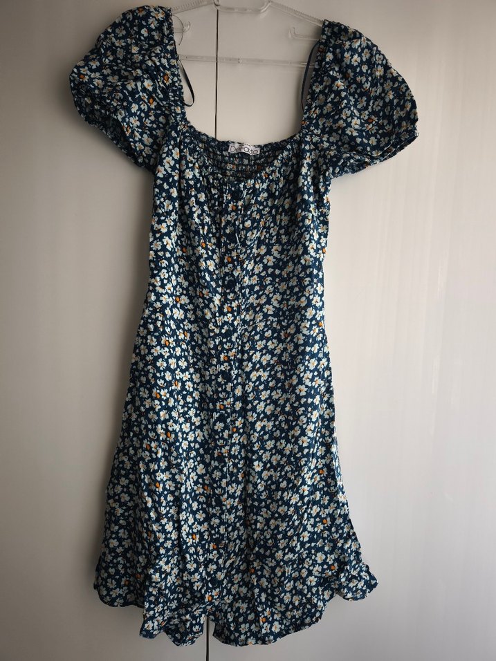 Mavi bohem tarzda, düğmeli, kısa balon kollu, straplez yaka ve koyu çiçekli desenli mini elbise.