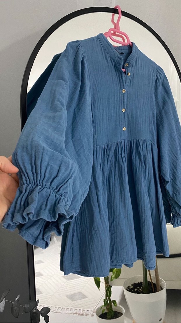 Düğmeli ön cepheli, uzun kollu, yüksek yakalı mavi keten bohem tunik Normal midi uzunlukta, bol kesim ve fırfırlı kol manşetleriyle.