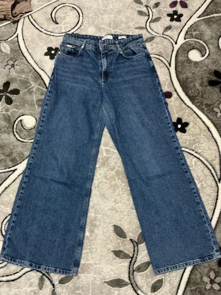 Düğmeli, mavi bol kesim kadın kot pantolon. Midi boy, gündelik rahat kullanım için uygundur.