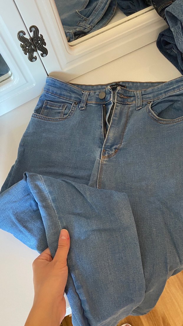Bu mavi kot pantolon, düğmeli önde ve bol kesim midi boydadır. Rahat ve gündelik sokak stili için uygundur, yumuşak ve konforlu kumaşa sahiptir.