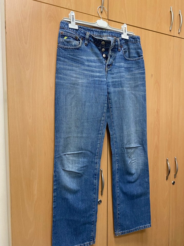 Düğmeli, bol kesim ve normal midi boyda mavi kot pantolon. Parlak kumaşa sahip, desen içermeyen rahat bir sokak stili ürünü.