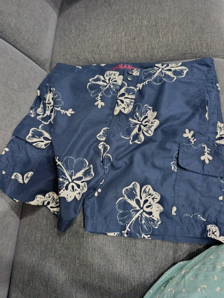 Düğmeli, mavi renkli ve beyaz çiçek desenli bol kesim erkek mayo şortu.yanlarda iki cep bacak kısmın da cep arka bir cep vardır.Günlük kullanıma uygun rahat sokak stiliyle tasarlanmıştır.