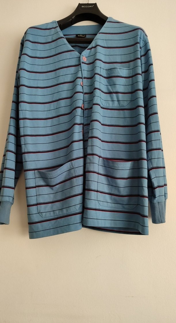 Düğmeli, uzun kollu, gevşek kesim erkek pijama üstü. Mavi ve gri çizgili, yuvarlak yakalı, rahat ve gündelik tarzda.