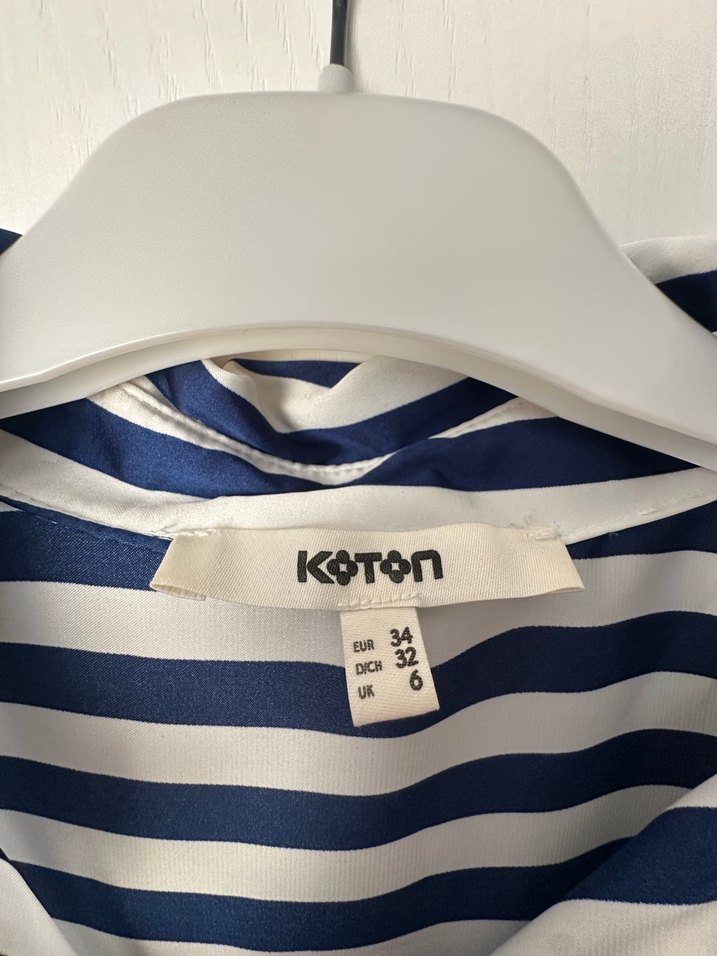 Düğmeli, kısa kollu ve tekne yaka mavi çizgili hamile bluzu. Parlak sentetik kumaştan, günlük rahat kullanıma uygun.