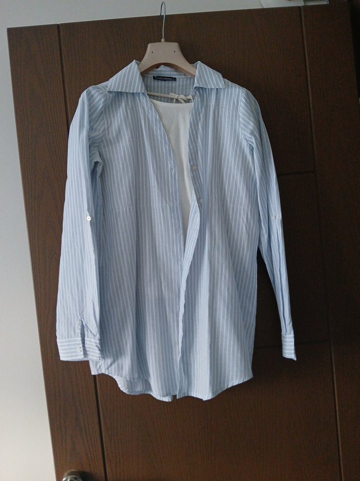 Düğmeli, yakalı ve uzun kollu hamile gömleği. Normal kesim ve midi boyda, yumuşak keten kumaştan, mavi çizgili desende. Günlük rahat kullanım için uygundur.