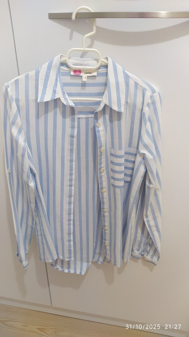 Düğmeli ve yakalı, uzun kollu mavi çizgili kadın gömleği. Yumuşak pamuklu kumaştan, rahat kesim ve günlük kullanıma uygun.