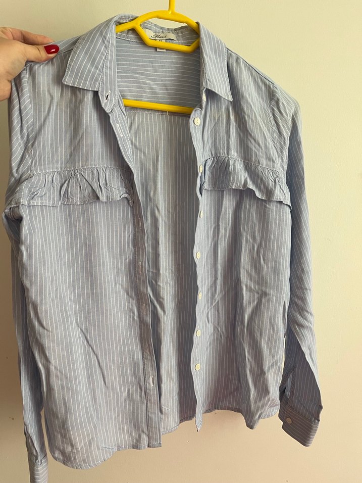 Düğmeli, yakalı ve uzun kollu kadın gömleği, yumuşak kumaştan üretilmiştir.