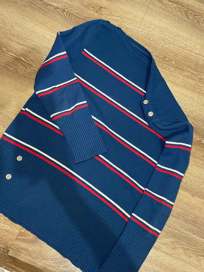 Kadın triko, düğmeli ve çizgili. V yaka, uzun kollu ve regular fit. Koyu mavi, kırmızı ve beyaz çizgilerle rahat sokak stiline uygun.
