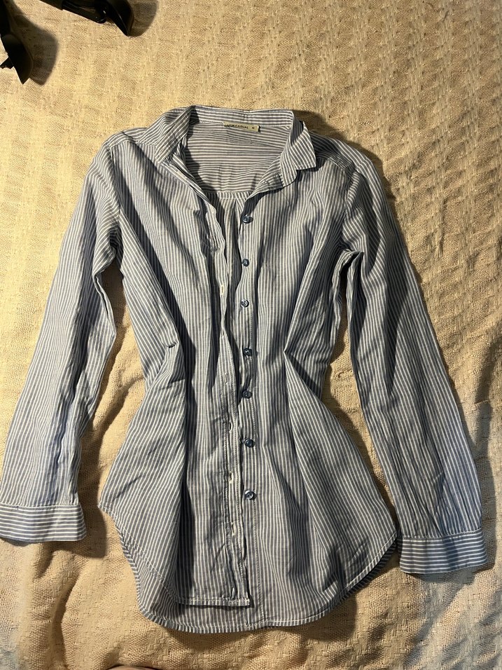 Düğmeli, keten kumaştan uzun kollu gömlek. Gri mavi renk ve ince çizgili desene sahip, rahat kesim, gündelik kullanıma uygun.