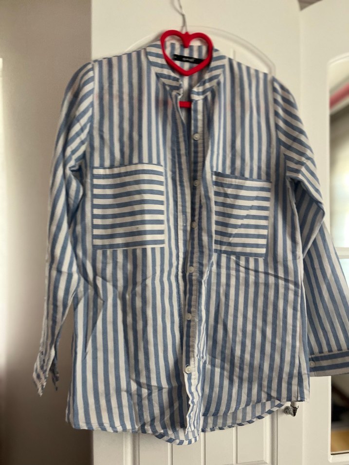 Düğmeli, uzun kollu, mavi çizgili pamuklu gömlek. Yaka detaylı, iki ön cep ve midi boyda, rahat kesim. Günlük kullanıma uygun. S beden