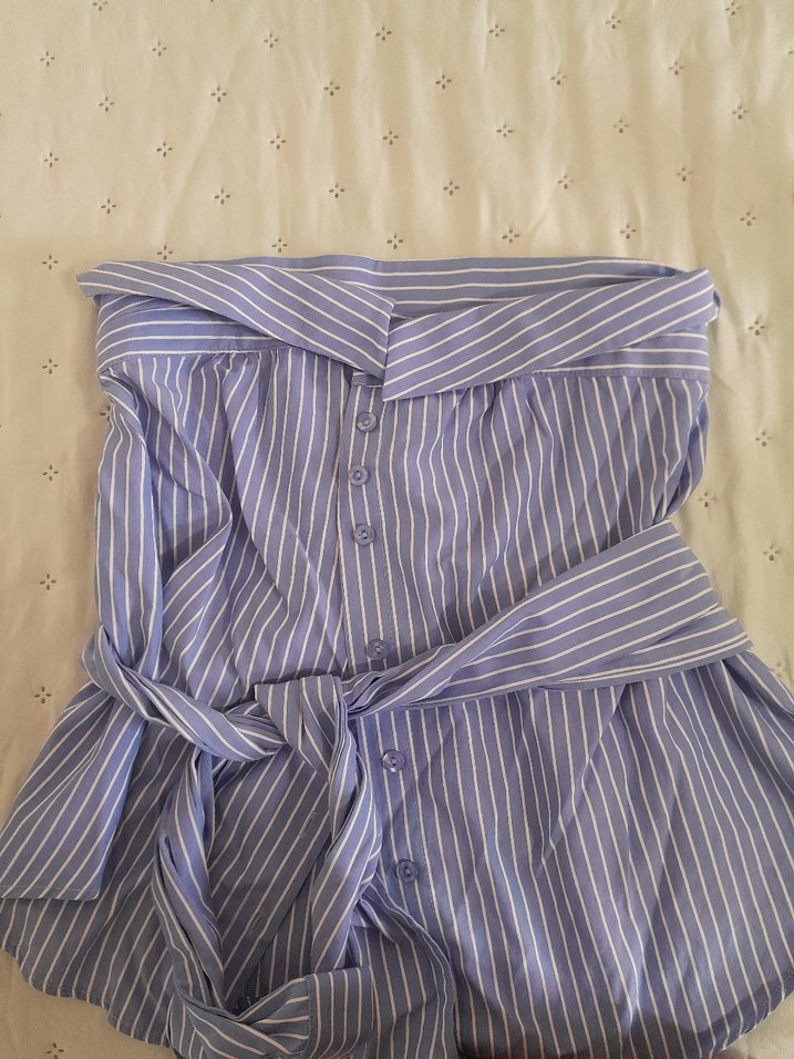Düğmeli Mavi Çizgili straplez bluz belden bağlama detaylı