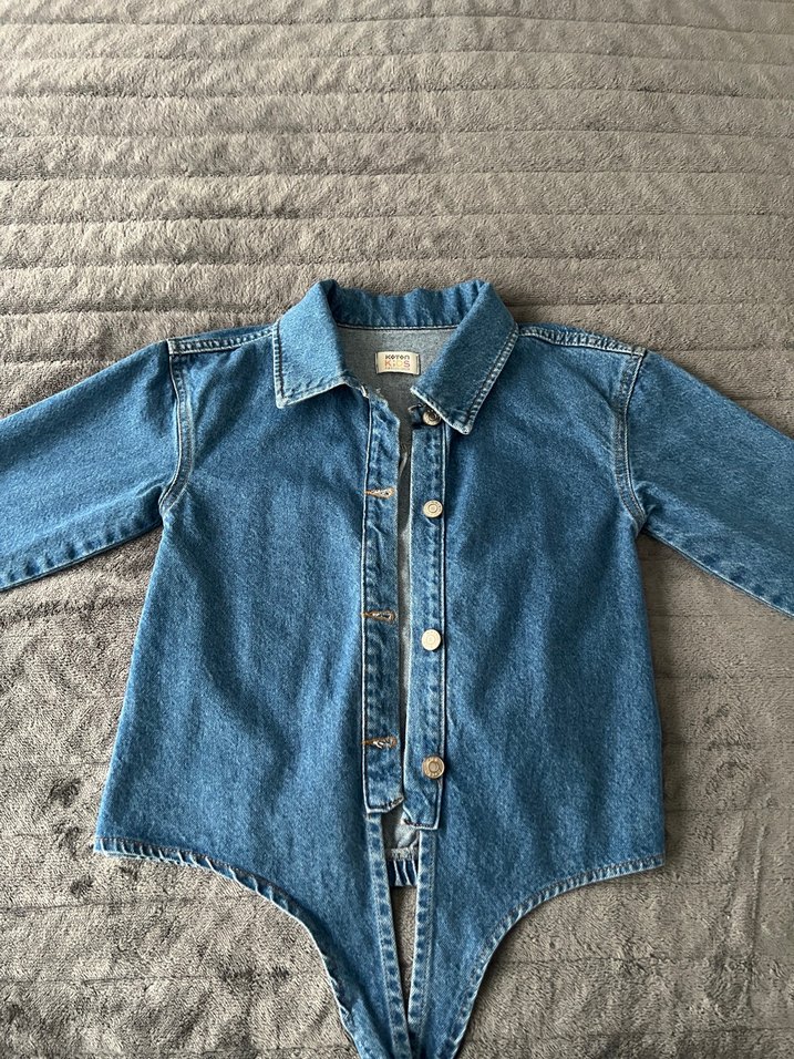 Mavi denim kumaştan, düğmeli ve yakalı uzun kollu kız çocuk ceketi. Rahat kesimli ve midi boyda, önünde bağlama detayı bulunur. Günlük sokak stili için uygundur. 7-8 yaş gömlek gibi de kullanılabilir