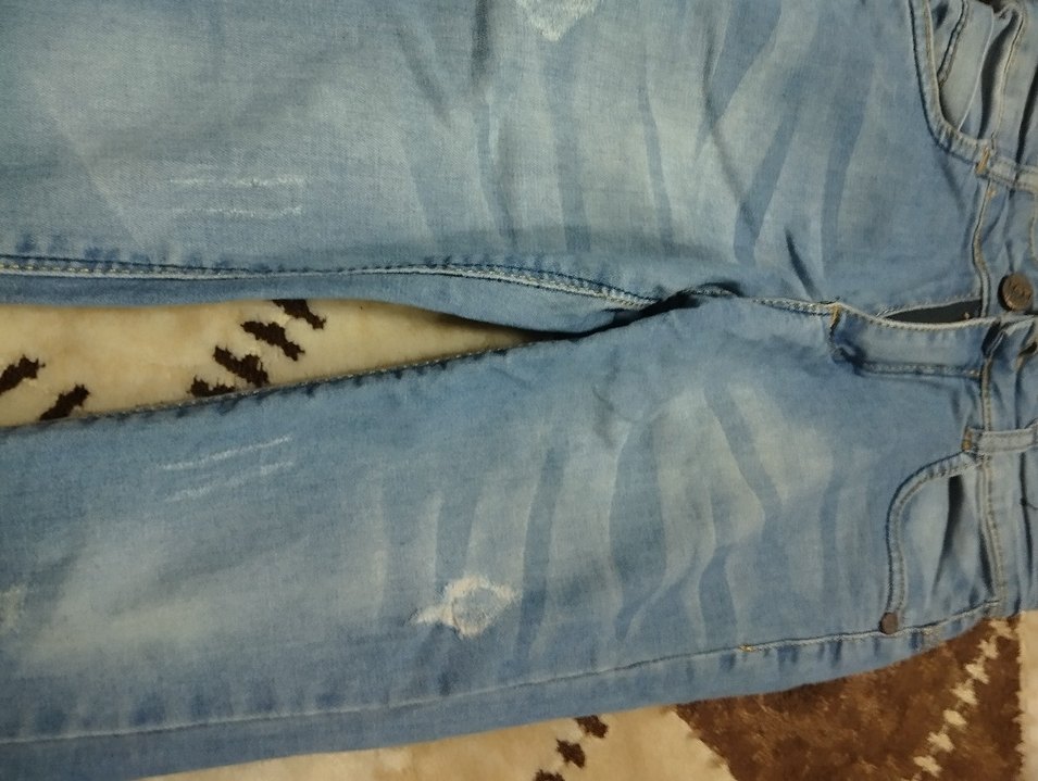 Düğmeli, mavi, fitted kesim denim pantolon. Normal midi boy, desen içermeyen ve parlak görünüme sahip, günlük rahat sokak stili için uygundur.