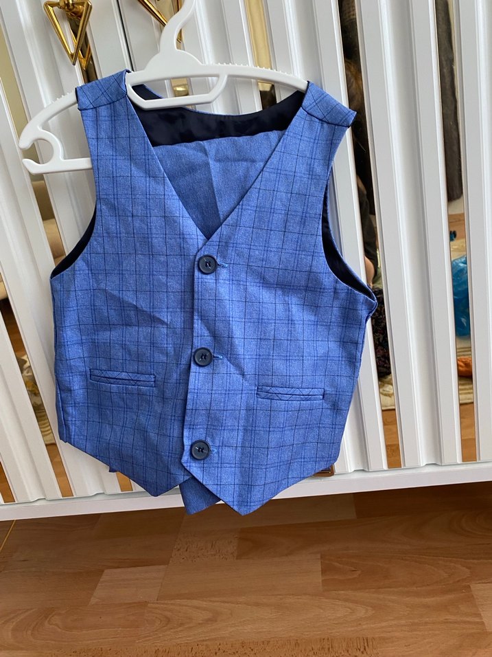 Düğmeli, mavi renkte, kareli desensiz, regular fit çocuk yeleği, kolsuz ve kesimli yakaya sahip. Takım pantolonlu