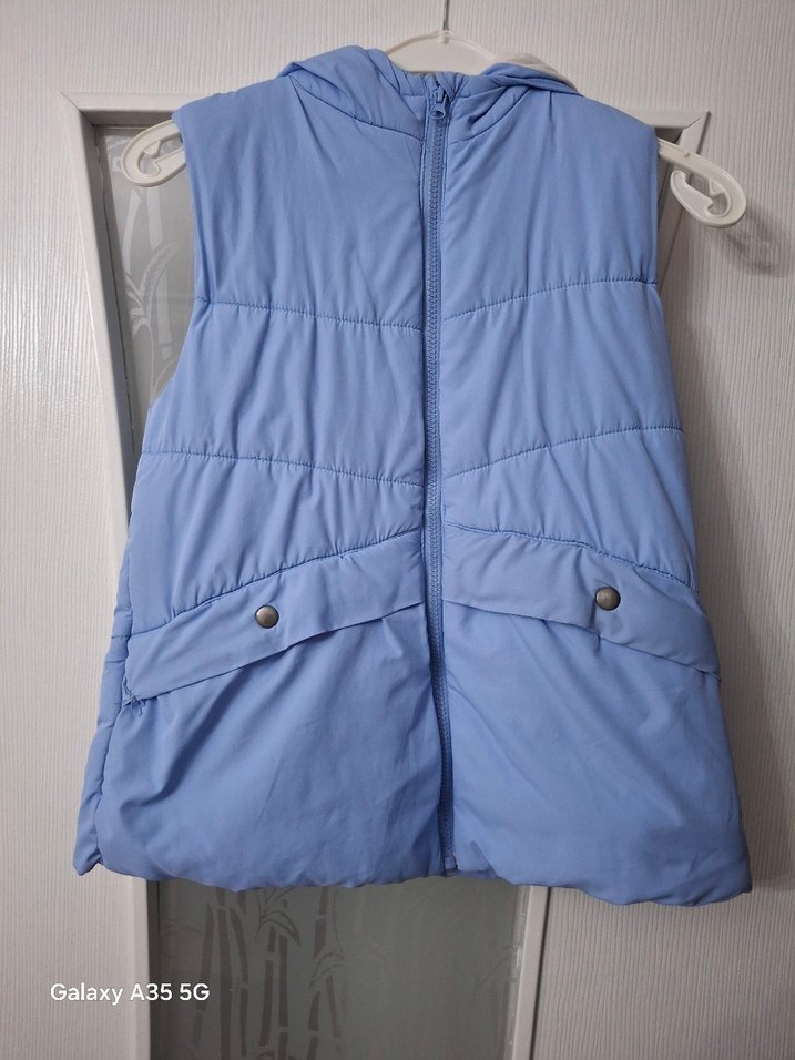 Düğmeli cepleri ve yakalı tasarımıyla, yumuşak sentetik kumaştan üretilmiş, midi boy ve fitted kesim mavi cocuk yelek