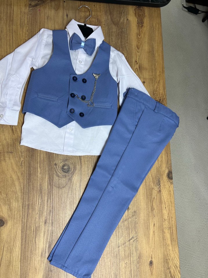 Düğmeli, yakalı mavi-gri çocuk yelek takımı, beyaz gömlek ve papyon ile tamamlanmıştır.