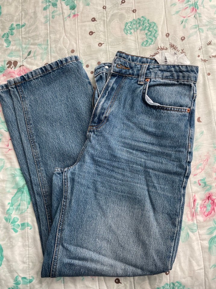 Düğmeli ve normal midi boyda, salaş kesim mavi denim jean. Pastel tonlarda batik desenli, günlük rahat sokak stili için uygun.