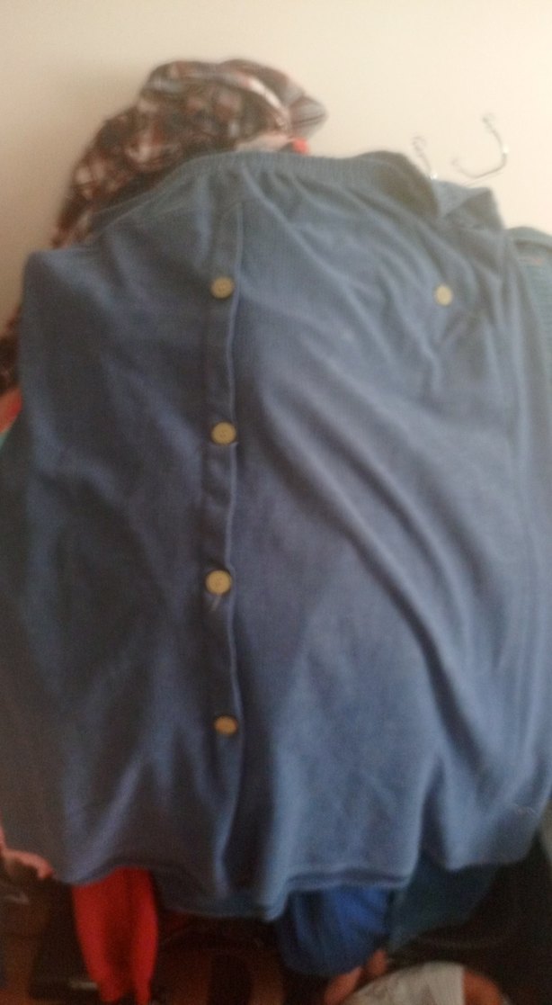 Düğmeli önü ve yuvarlak yakası olan, bol kesim mavi parlak denim hamile gömleği. Normal uzunlukta, midi boyda ve uzun kolludur, günlük rahat kullanım için uygundur. iki yan yerinde yırtık vardır