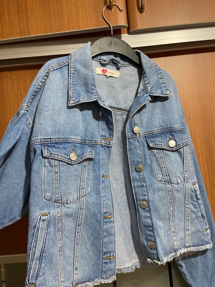 Bu mavi denim ceket, düğmeli kapanış, notlu yakalı ve uzun kollu bol kesimdir. Günlük kullanım için uygun, bağlama desenli rahat bir sokak stili sunar.