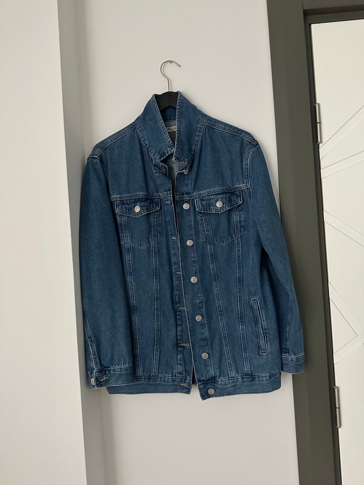 Uzun kollu, düğmeli, notched lapel yaka detaylı, bol kesim mavi denim ceket. Günlük kullanım için uygundur.