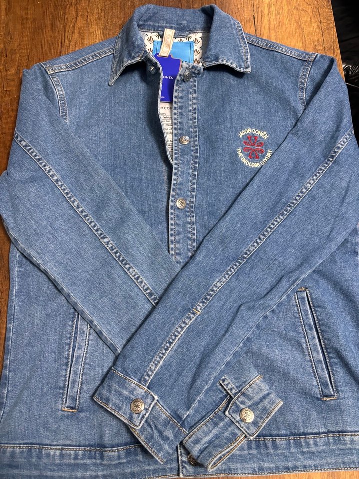 Mavi denim ceket, düğmeli ve kesik yaka detaylıdır. Uzun kollu, normal kesim ve günlük rahat kullanıma uygundur. Ceketin parlak bir görünümü ve göğüste küçük nakış detayı vardır.