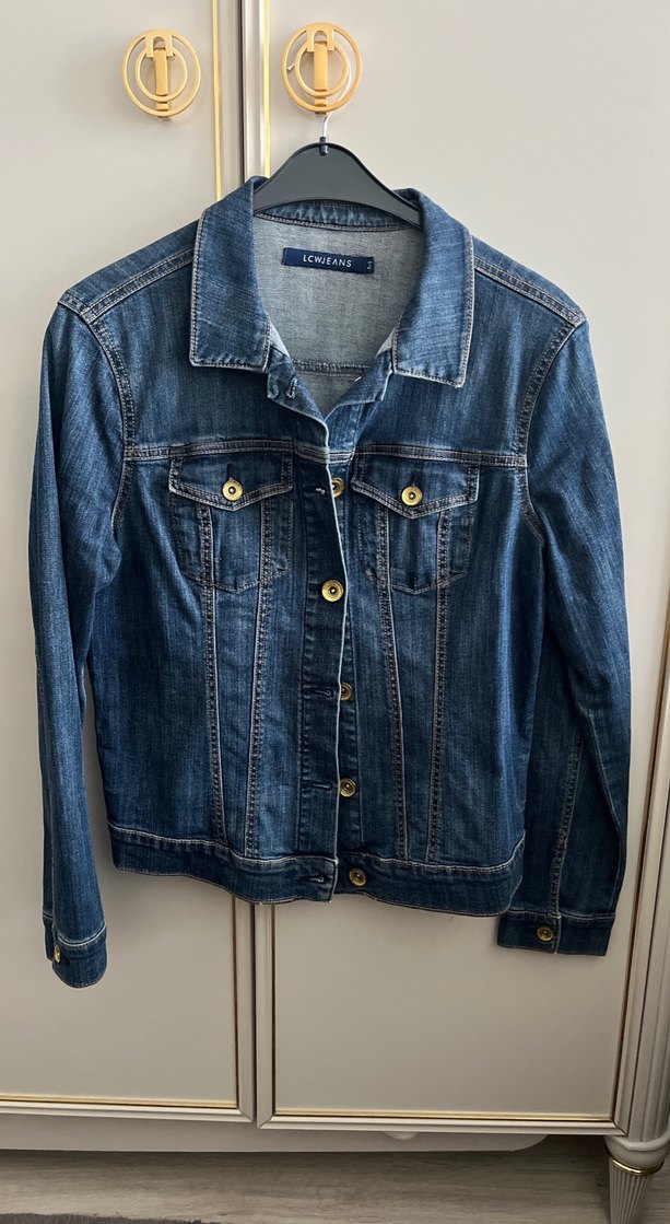 Düğmeli, parlak mavi renkte, uzun kollu denim ceket. LCW markalı, gündelik kullanıma uygun.