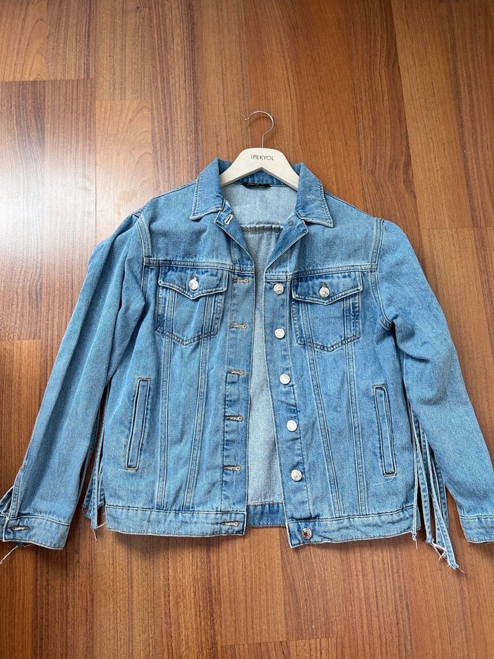 Düğmeli, uzun kollu, mavi denim ceketin normal kesimi ve parlak yüzeyi vardır. Günlük rahat kullanım için uygundur. Serenay sarıkaya koleksiyonuna aittir