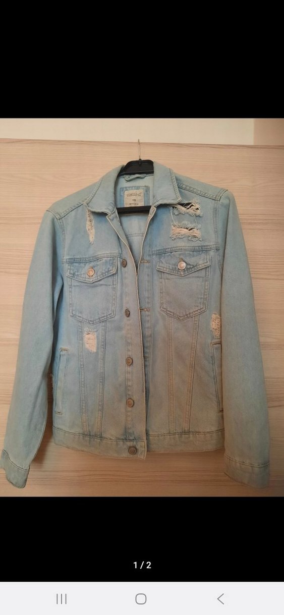 Düğmeli, açık mavi denim ceket, notched lapel yaka ve bol kesim. Uzun kollu, yıpranmış detaylı, günlük rahat stil için uygun. hiç kullanılmadı