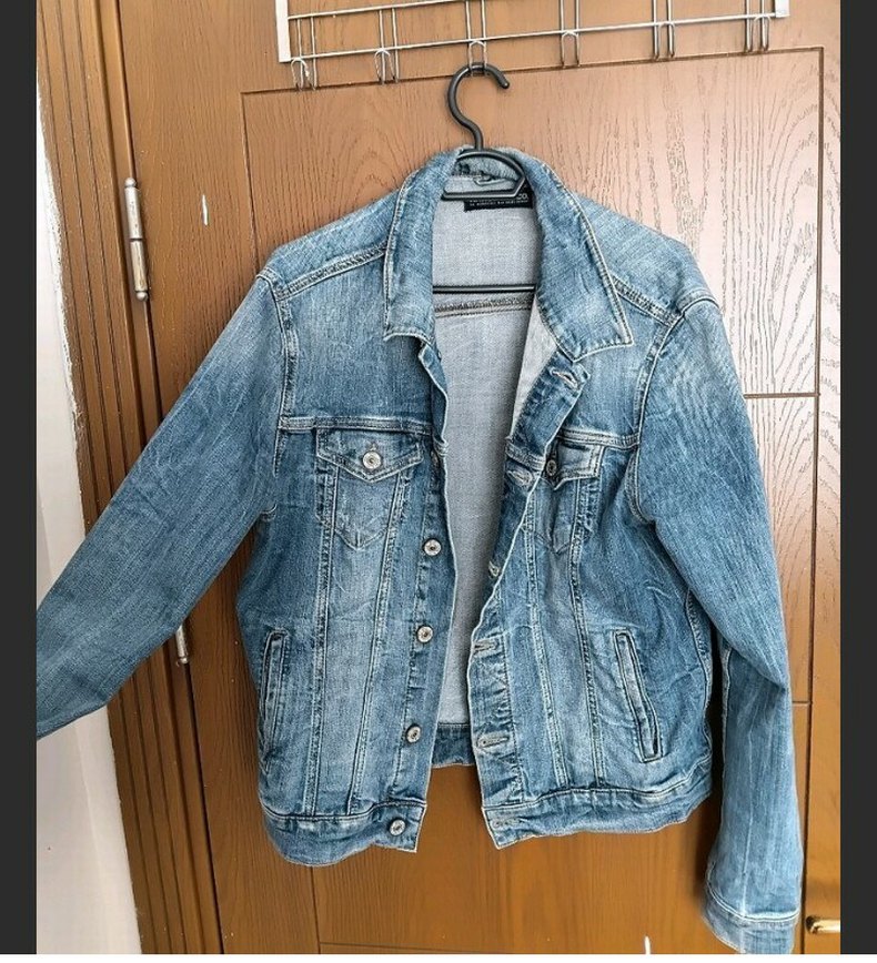 Mavi denim ceket, düğmeli ve yakası kesik. Uzun kollu ve normal kesim, günlük sokak stiline uygun.