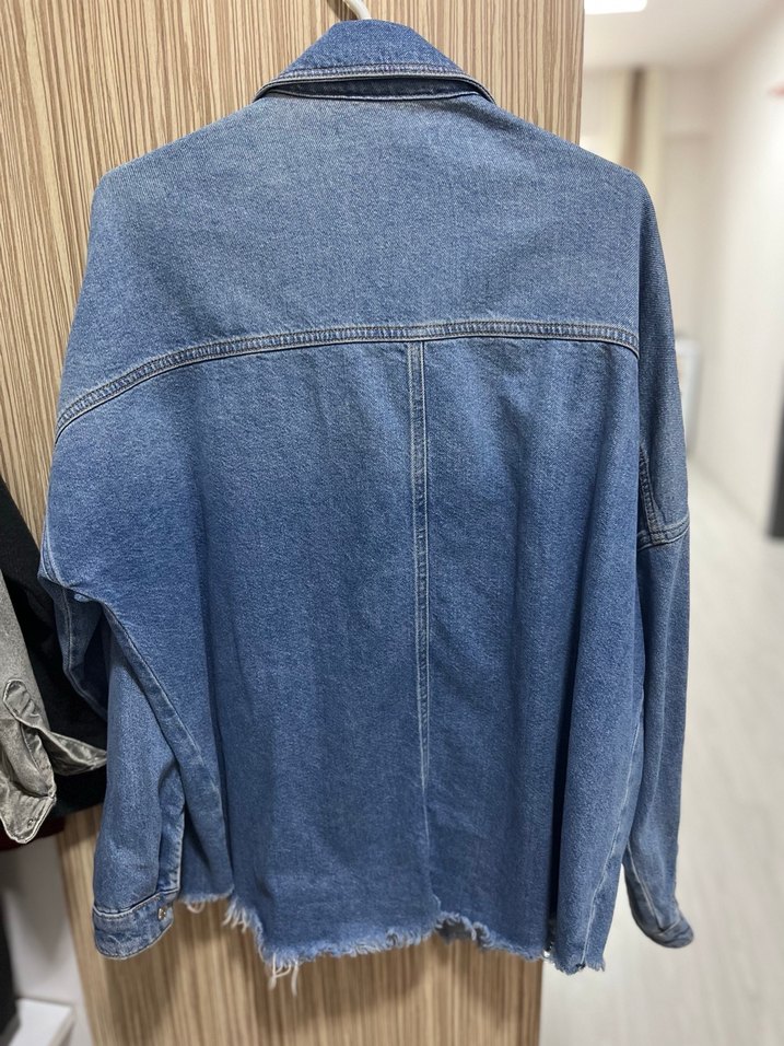 Düğmeli, uzun kollu mavi denim ceket. Notlu yaka ve midi boyda, rahat kesim, günlük kullanıma uygun sokak stili