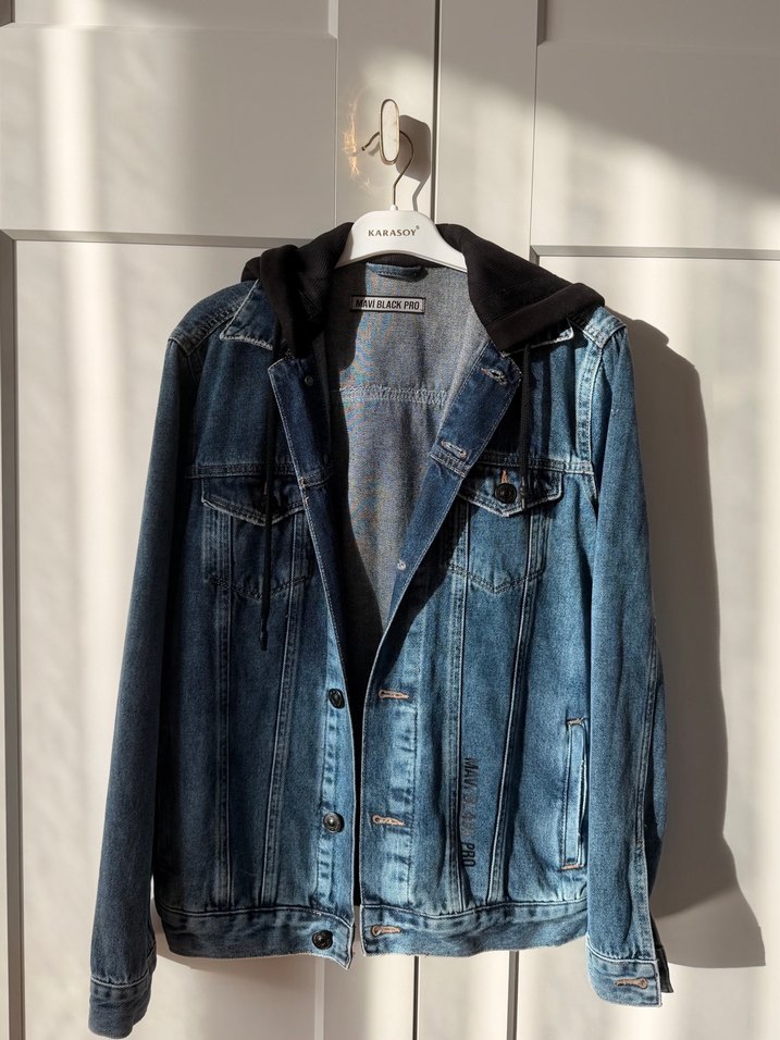 Düğmeli, notched lapel yakalı mavi denim ceket. Bol kesim, uzun kollu, günlük kullanıma uygun sokak tarzı. Siyah kapüşonlu. %100 Pamuk.