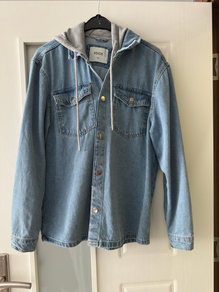 Mavi denim kumaştan, düğmeli ve kapüşonlu, bol kesim uzun kollu ceket. Günlük kullanıma uygun rahat bir tasarım.