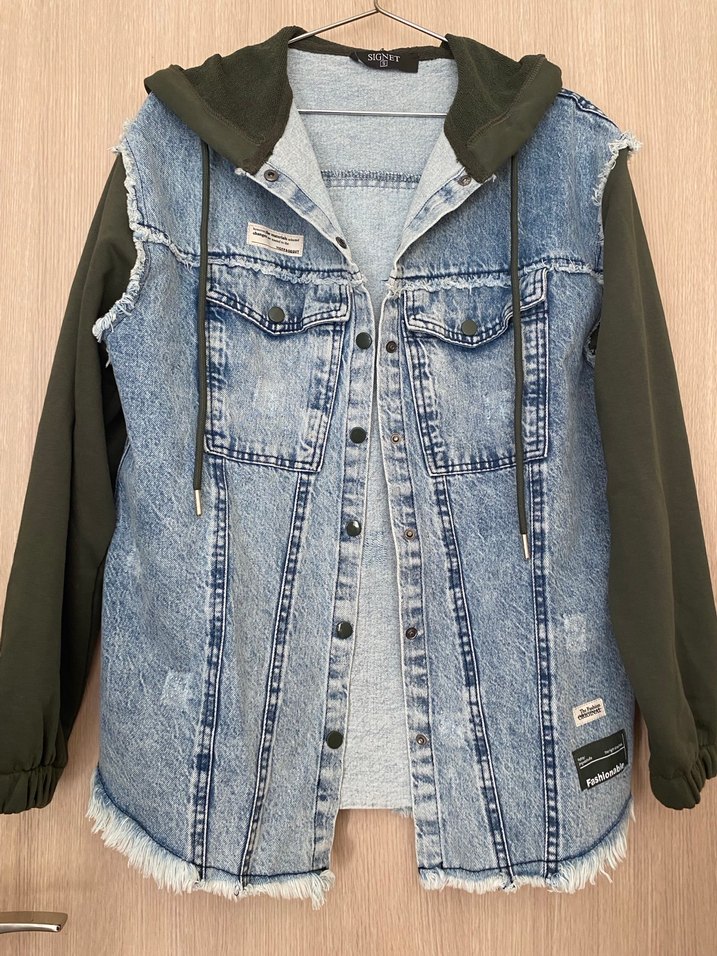 Düğmeli, bol kesim mavi denim ceket, uzun haki kollu ve kapüşonlu. Notlu yaka ve midi boyda, günlük sokak stiline uygun. İki kere giydim, neredeyse sıfır ayarında tertemiz. Bana büyük geldiği için satıyorum. S ve M beden uyumlu