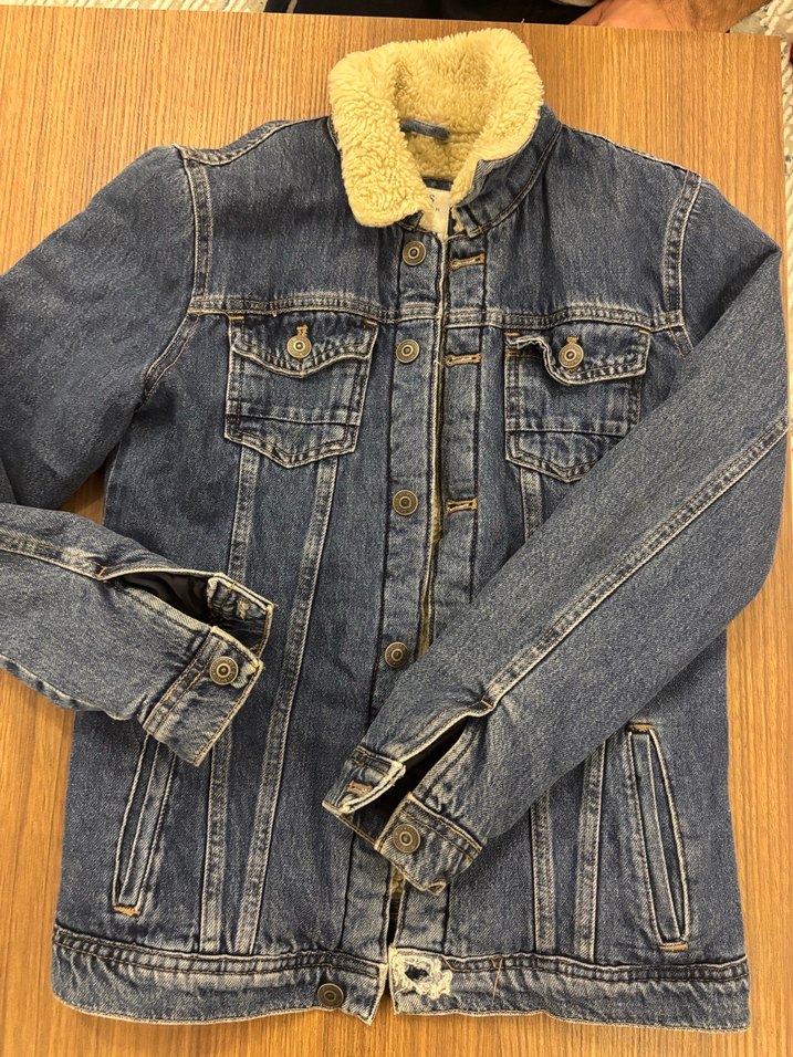 Düğmeli, uzun kollu ve yaka kısmı sıcak astarlı, fitted kesim kadın mavi denim ceket. Günlük kullanıma uygun rahat sokak tarzı.
