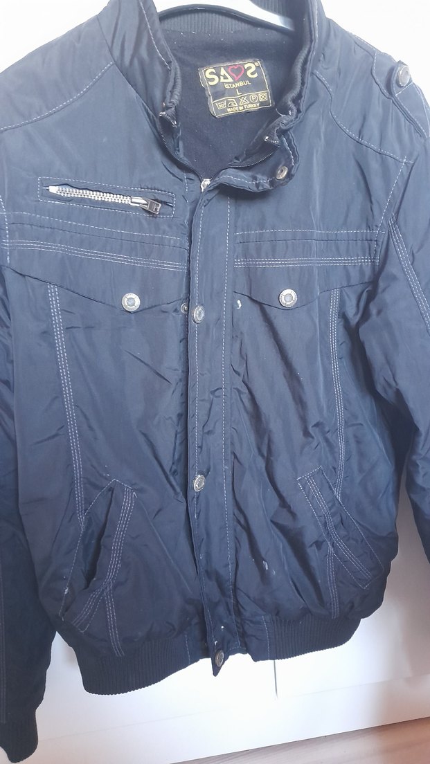 Düğmeli, notched lapel detaylı, uzun kollu, bol kesim mavi denim erkek ceket. Günlük sokak stiline uygun cepli tasarım sunar.