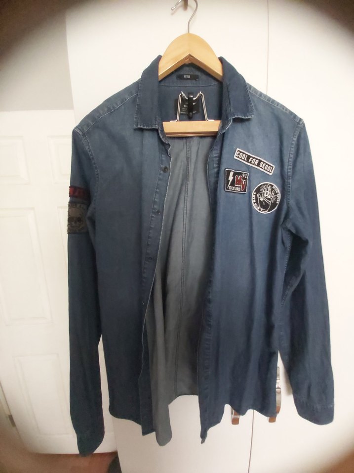 Düğmeli, -mavi renkte denim erkek gömlek. Notch yakalı, uzun kollu spor orjinal mavi ürünüdür