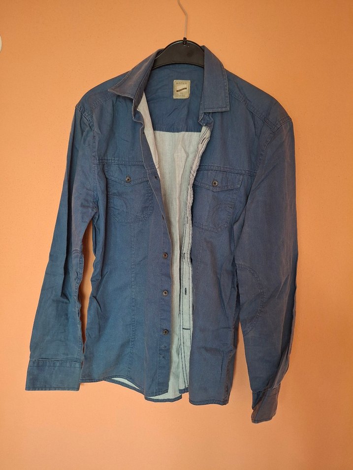 Düğmeli, uzun kollu mavi denim erkek gömlek, normal boyda ve regular fit. Notched lapel yakalı, günlük sokak stiline uygun. Kadın erkek uygun