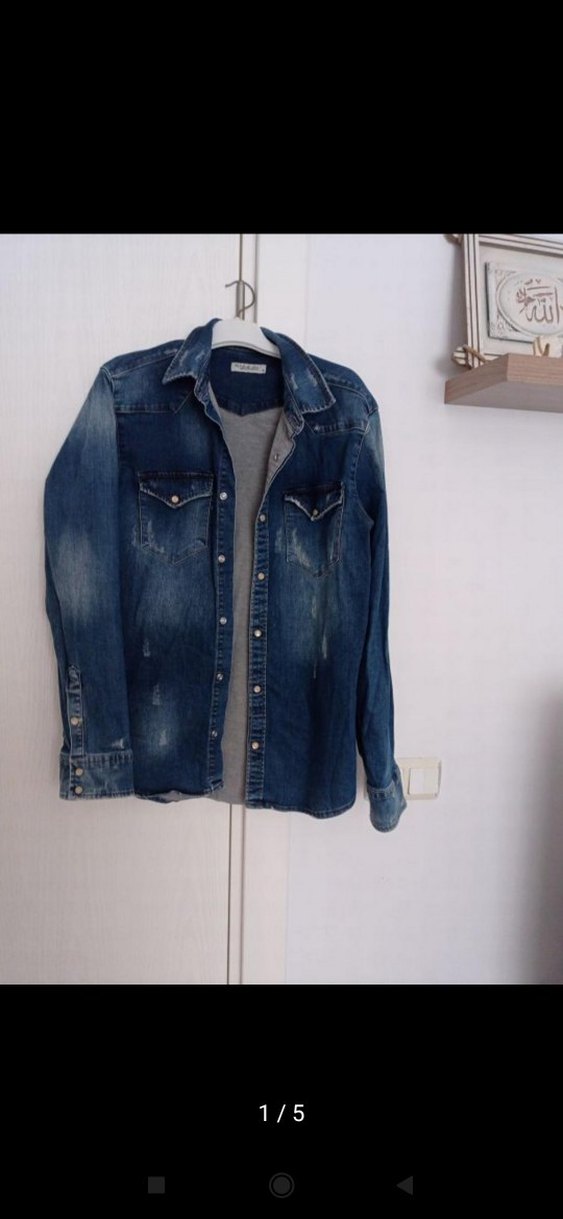 Mavi denim kumaştan, uzun kollu ve yakası notched lapel olan düğmeli erkek gömleği. Rahat ve likralı kesim, günlük sokak stili için uygun.