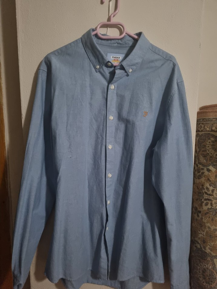 FARAH marka mavi erkek uzun kollu gömlek. Hiç giyilmedi fakat önünde ufak makas kesiği var. M beden.
