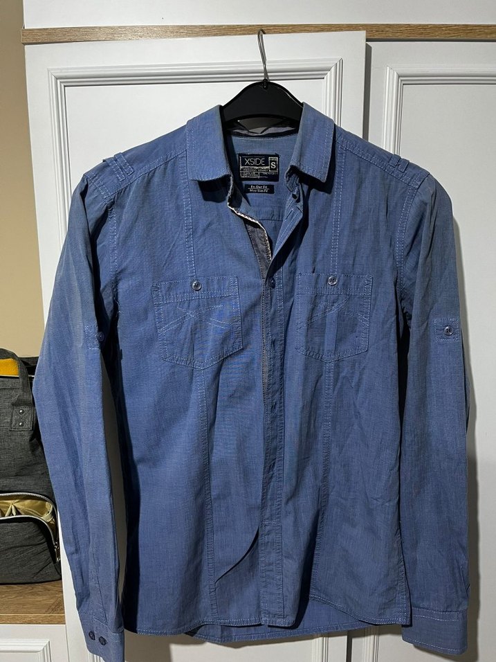 Düğmeli ön cep detaylı, uzun kollu, regular fit mavi denim erkek gömlek. Günlük kullanıma uygun rahat tarzda.